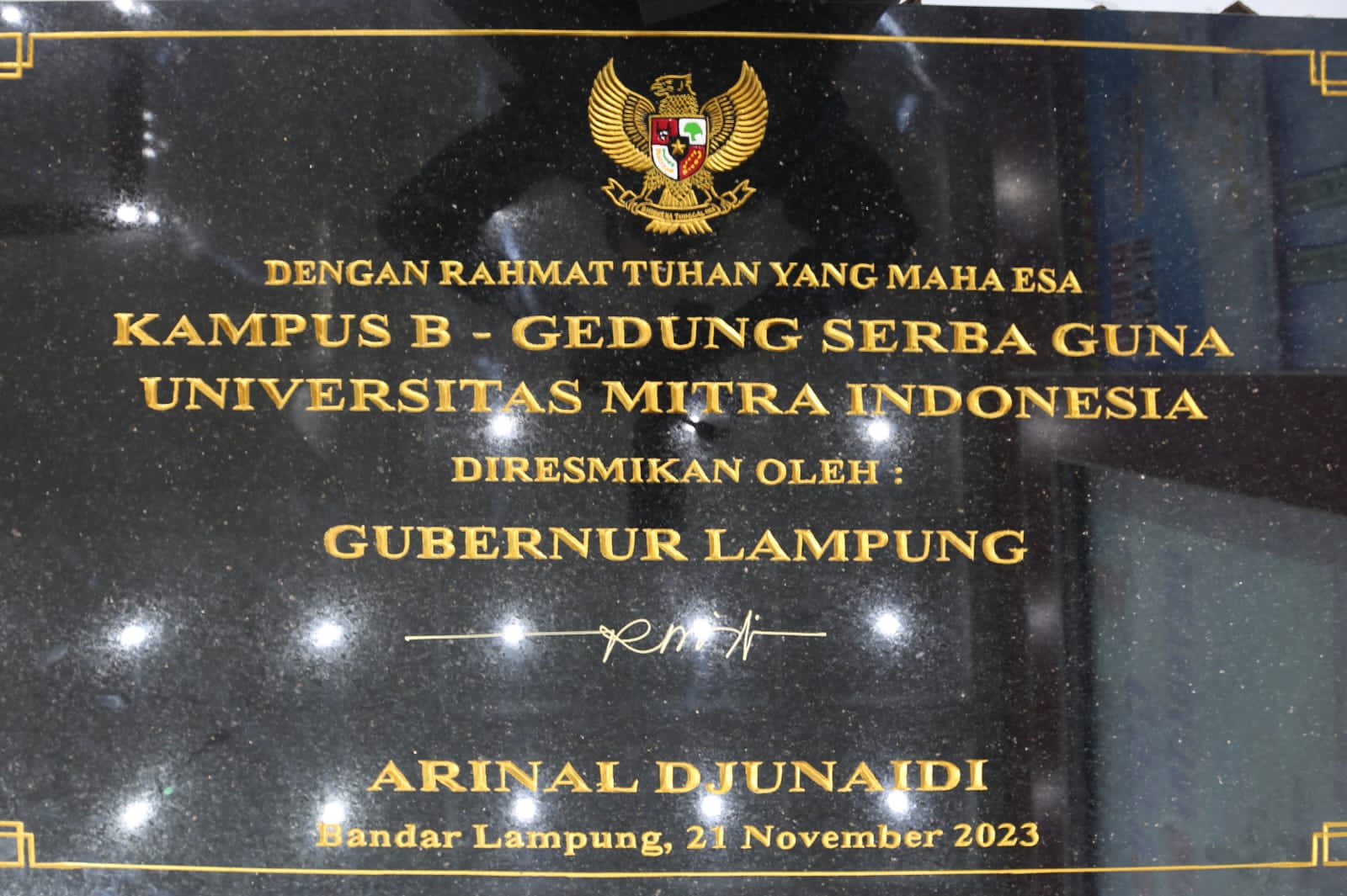 “Hari ini saya menandatangani prasasti Kampus B khususnya pada GSG Umitra, merupakan kehormatan bagi saya dan jajaran Pemerintah Provinsi Lampung yang bisa memberi penanda pada saat fasilitas GSG ini digunakan untuk pendidikan,” ujar Arinal.