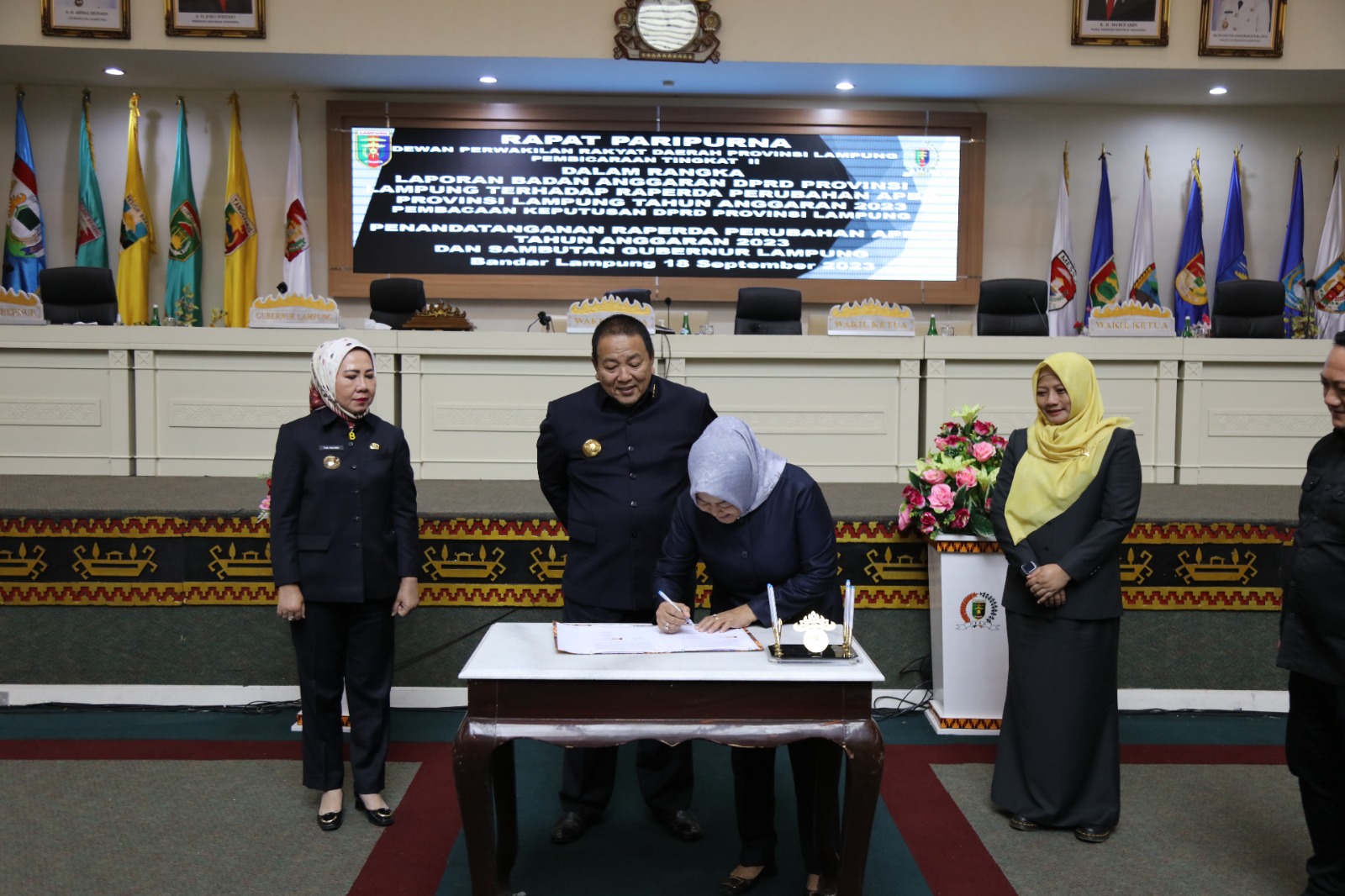 BANDAR LAMPUNG —-Gubernur Lampung Arinal Djunaidi dan Pimpinan DPRD Provinsi Lampung menandatangani Raperda Perubahan APBD Provinsi Lampung Tahun Anggaran 2023 dalam Sidang Paripurna Pembicaraan Tingkat II Persetujuan Bersama Terkait Rancangan Perubahan Anggaran Daerah APBD Provinsi Lampung Tahun Anggaran 2023, di Ruang Sidang Paripurna, Senin, (18/09/2023).