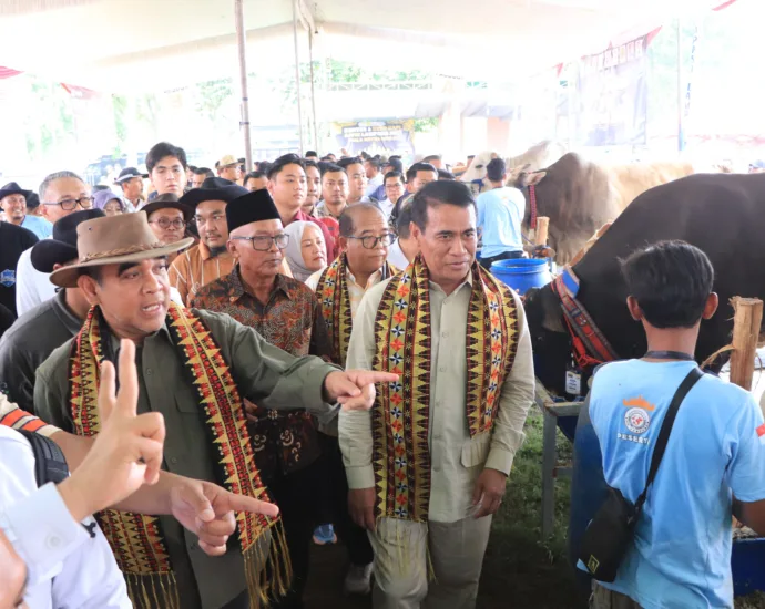 Penjabat (Pj) Gubernur Lampung, Samsudin mendampingi Menteri Pertanian Andi Amran Sulaiman  membuka secara resmi Kontes dan Expo Sapi Asosiasi Peternak dan Penggemuk Sapi Indonesia (APPSI) DPD Lampung Piala Ketua MPR RI 2024, di lapangan PU Bandar Jaya, Sabtu (16/11/ 2024).