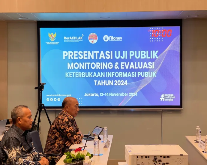 Pemerintah Provinsi Lampung diwakili oleh Asisten Perekonomian dan Pembangunan, Ir. Mulyadi Irsan, M.T. didampingi Kepala Dinas Komunikasi, Informatika, dan Statistik Provinsi Lampung Achmad Saefulloh, S.H., M.H. mengikuti rangkaian Monitoring dan Evaluasi (Monev) Keterbukaan Informasi Publik (KIP) 2024, Komisi Informasi Pusat melaksanakan uji publik kepada Badan Publik yang terpilih, dihadapan panel yang terdiri dari, anggota Komisi Informasi Pusat dan sejumlah ahli di bidang keterbukaan informasi dengan model presentasi dan wawancara, di Hotel Grand Mercure Kemayoran Jakarta, Rabu, (13/11/2024).