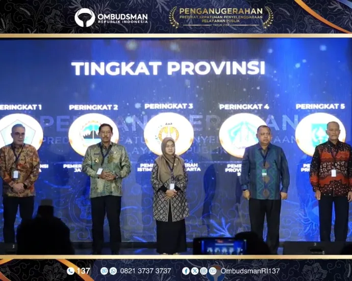 Ombudsman Republik Indonesia (RI) memberikan Predikat Penilaian Kepatuhan Penyelenggaraan Pelayanan Publik (Opini Pengawasan Penyelenggaraan Pelayanan Publik Tahun 2024) kepada Pemerintah Provinsi Lampung di Hotel Le Meridien, Jakarta, Kamis (14/11/2024).
