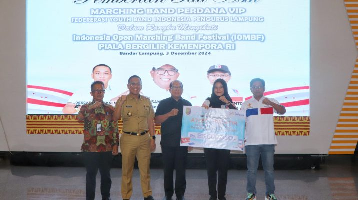 Pj. Gubernur Lampung, Samsudin menyerahkan penghargaan dan tali asih kepada Marching Band Federasi Youth Band Indonesia (FYBI) Pengurus Lampung, di Mahan Agung, Selasa (3/12/2024).