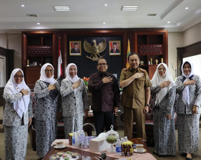 Pj. Gubernur Lampung Samsudin menerima kunjungan Pengurus Daerah Ikatan Bidan Indonesia (IBI) Provinsi Lampung dalam rangka konsolidasi dan membangun sinergi peran organisasi profesi bidan mendukung program kesehatan dan Keluarga Berencana (KB), di Ruang Kerja Gubernur, Kompleks Kantor Gubernur, Bandarlampung, Selasa (26/11/2024).
