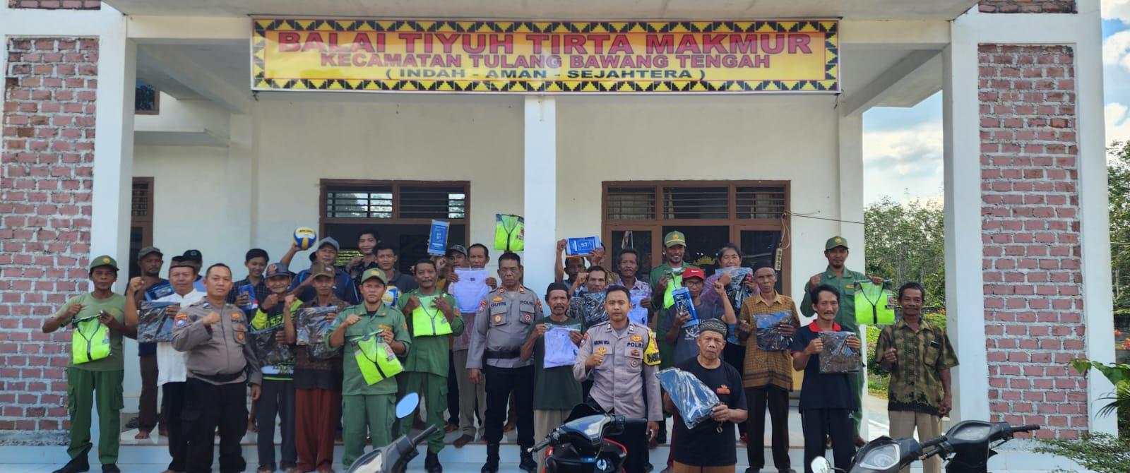 “Pada kesempatan ini juga kami memberikan bantuan atau sarana kontak berupa Sarung, kain batik, kaos Kamtibmas, Bola Voli, Senter, Kaos linmas dan Peci kepada Petugas linmas Tiyuh Tirta Makmur.” Tegasnya