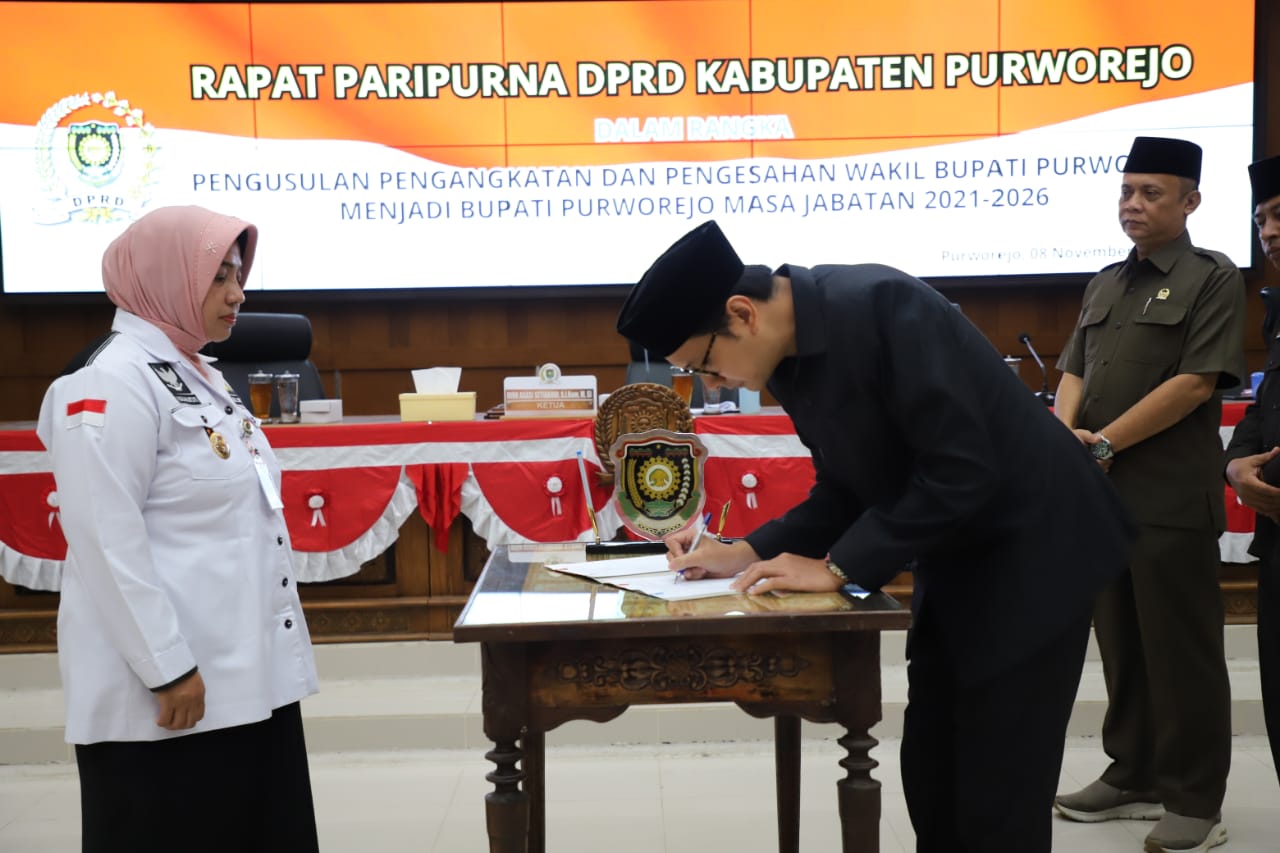 Sidang dilanjutkan dengan penandatanganan berita acara oleh Ketua DPRD beserta para Wakil Ketua, disaksikan secara langsung oleh Plt Bupati Purworejo dan semua yang hadir.